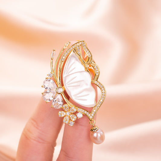 Butterfly Brooch Pin in Mother of Pearl, Peach Drop Pearl, and CZ Jewelry in Yellow...