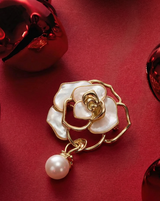 White Rose Brooch Pin Jewelry with Mother of Pearl Inlay, Drop Pearl, and Yellow Gold...