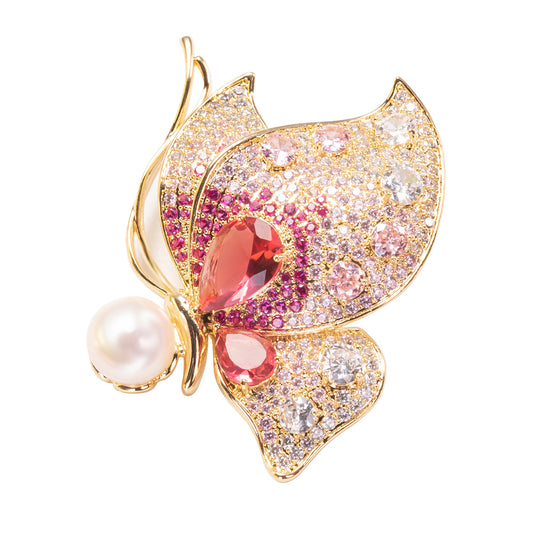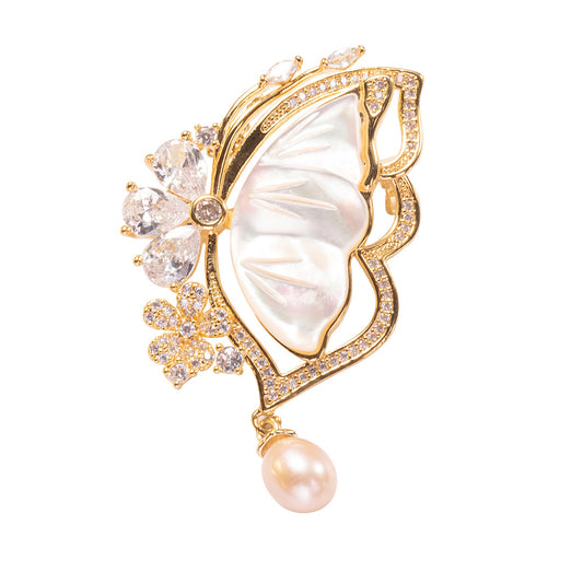 Butterfly Brooch Pin in Mother of Pearl, Peach Drop Pearl, and CZ Jewelry in Yellow...