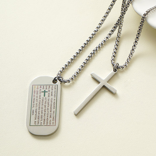 ✝️ Lord's Prayer Cross & Dog Tag Pendant Necklace in Stainless Steel – 24" Chain...