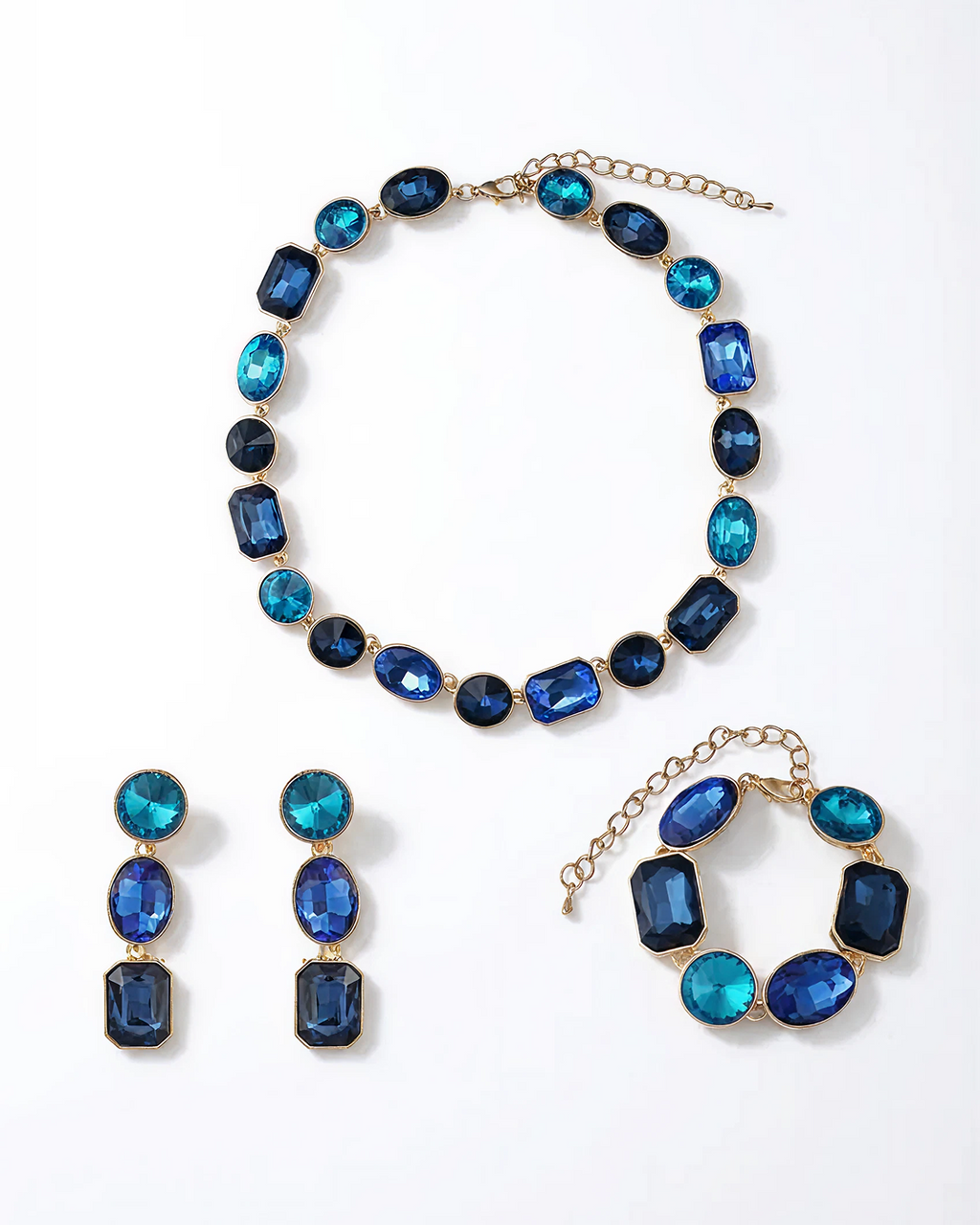 Art Deco Jewelry Set with Multicolor Blue Crystals | Yellow Gold Plated Brass — Necklace...