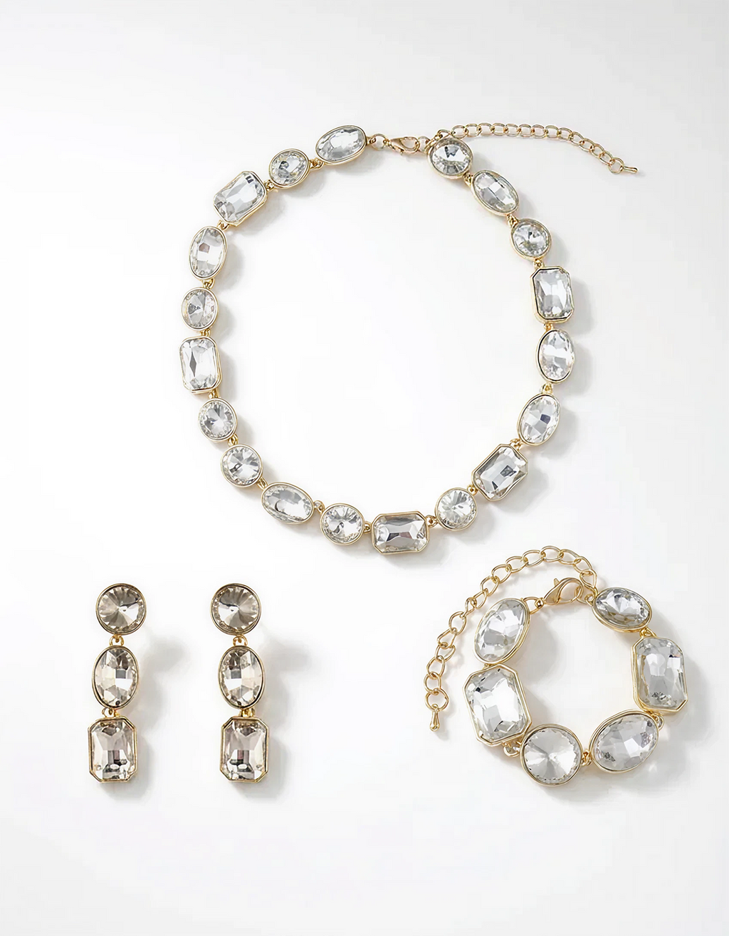 Art Deco Jewelry Set with White Crystals | Yellow Gold Plated Brass — Necklace, Bracelet...