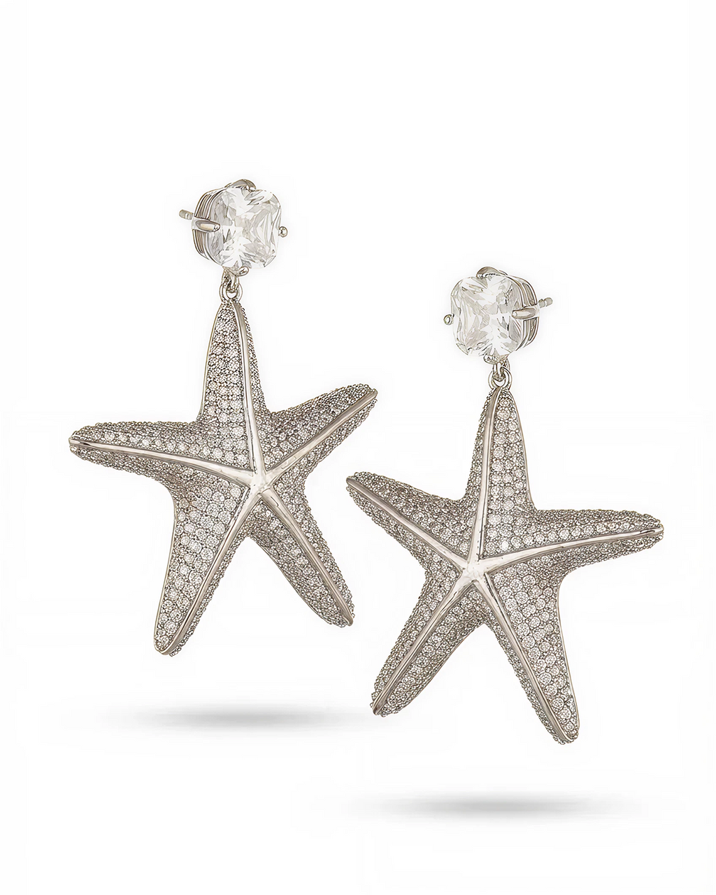 Statement Starfish Earrings with Pavé Simulated Diamonds | Brass with Silver Findings — 2.15" Add...