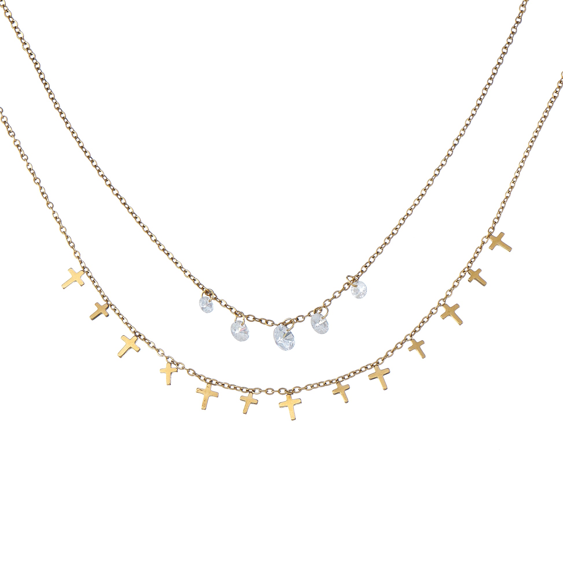 Cross Charm Layered Necklace with Diamond Simulated in Stainless Steel in IP Yellow Gold 18"+2" extender