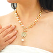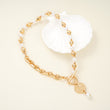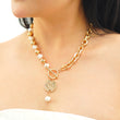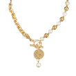 Designer Coin Necklace with Pearl and T lock in Yellow Gold Over Brass