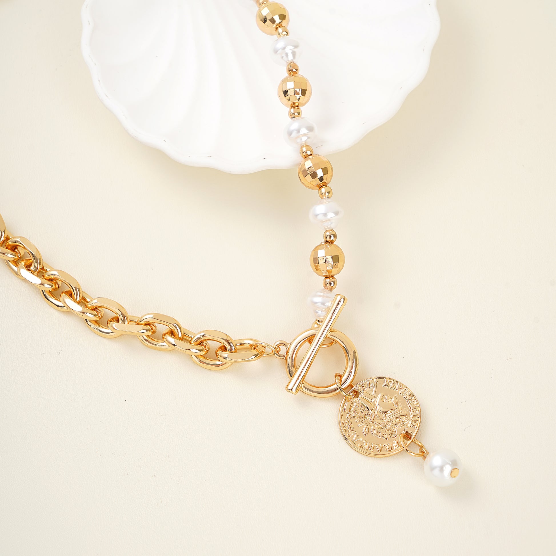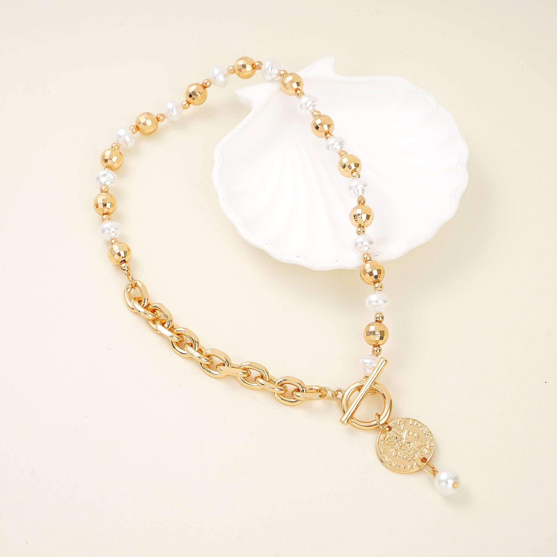 Affordable Luxury-Designer Coin Necklace with Pearl & T-Bar Clasp – Yellow Gold Over Brass