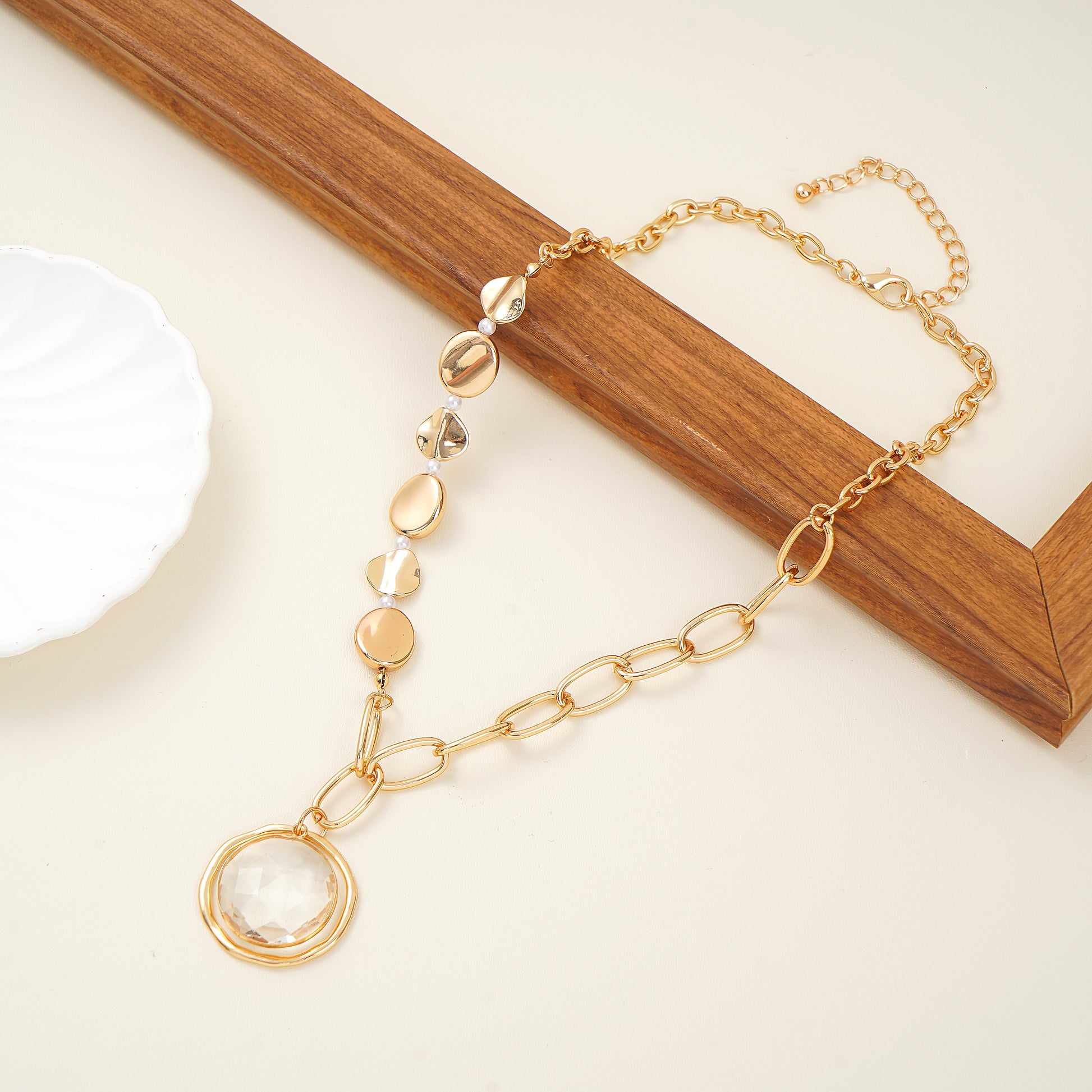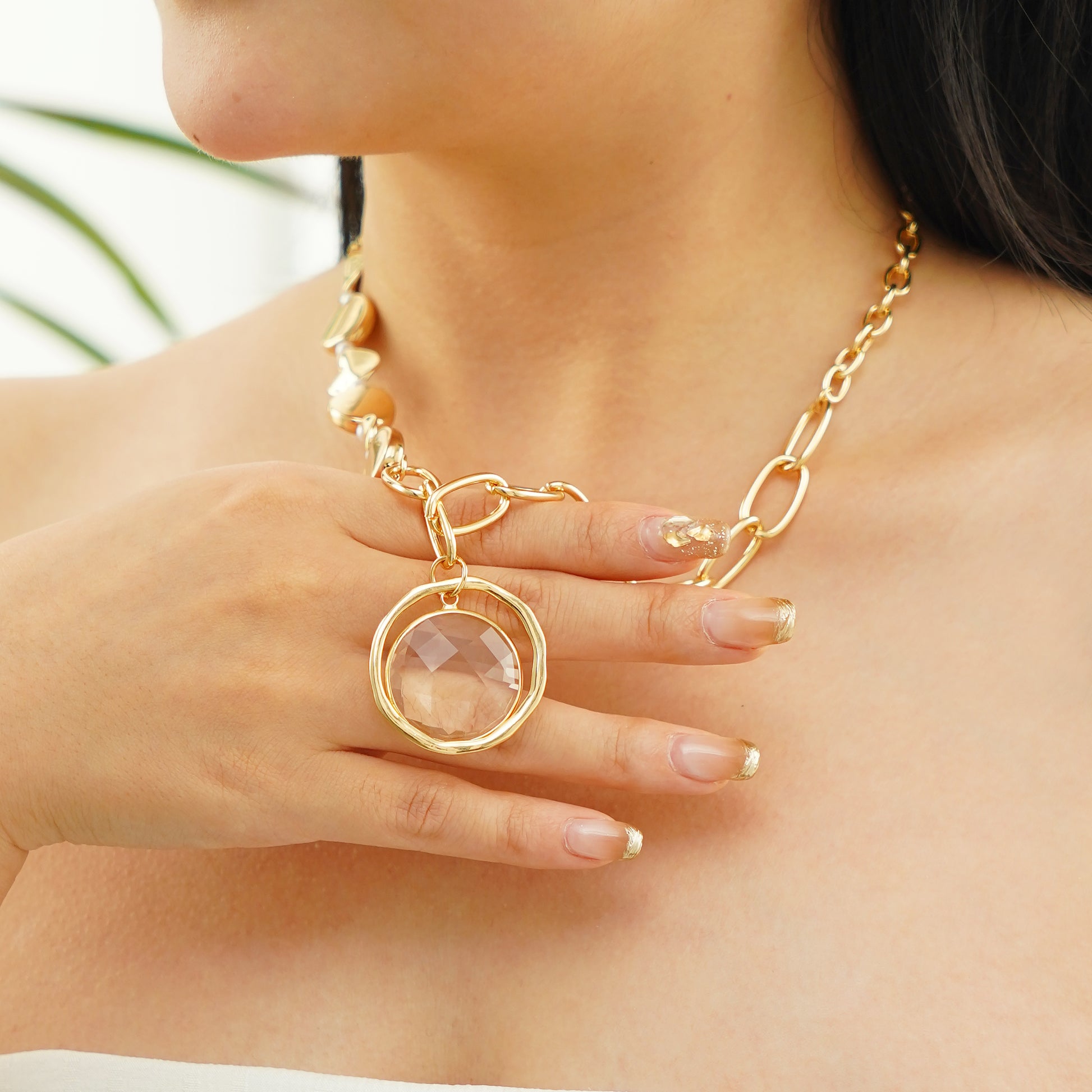 Elevate your style with our Designer Necklace featuring a sparkling crystal medallion in yellow gold over brass. This statement piece combines timeless elegance with contemporary flair, making it perfect for both everyday chic and special occasions.