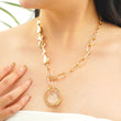 The intricate medallion is adorned with shimmering crystals, set against a high-shine yellow gold over brass finish for a luxurious look without the high price tag. Lightweight yet durable, this necklace can be worn solo for a striking statement or layered with other pieces to follow the latest layered jewelry trends.