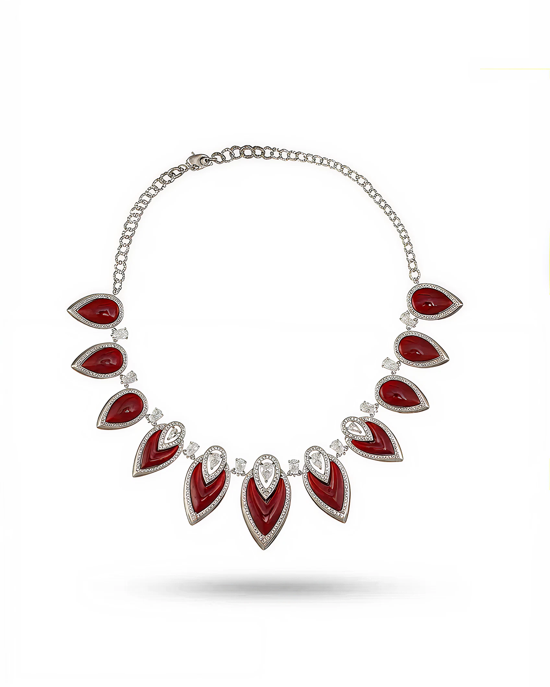 Make a bold and elegant statement with this stunning Designer Statement Necklace, featuring vivid simulated red coralaccented with brilliant pavé simulated diamonds. The striking contrast of rich, deep red and sparkling stonework creates a look that is both glamorous and sophisticated — perfect for those unforgettable moments.