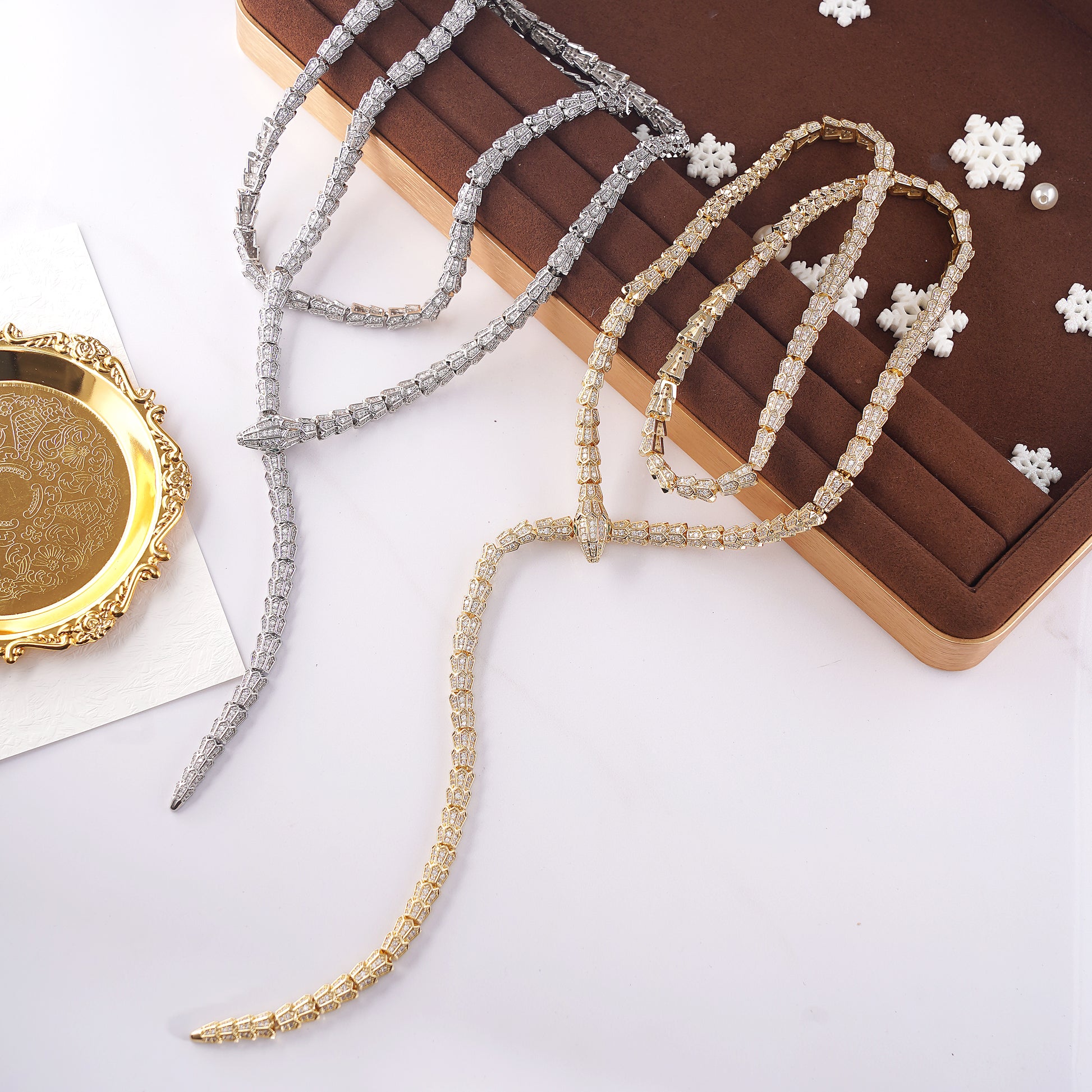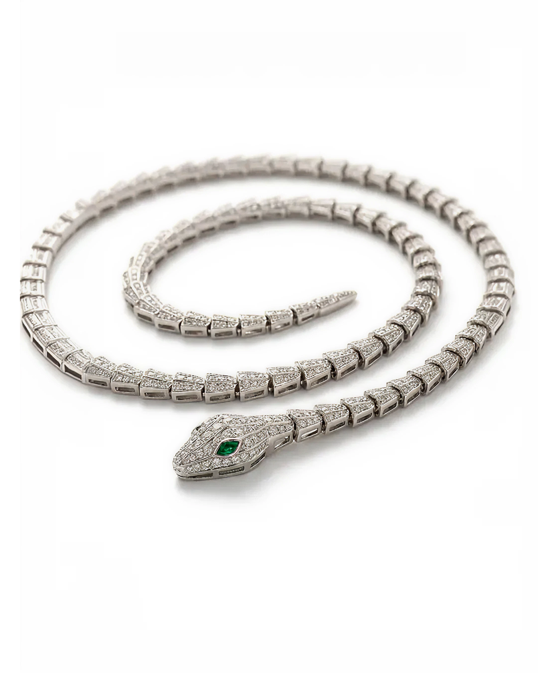 Turn heads with this Designer Snake Wrap Necklace, a bold statement piece that exudes confidence, elegance, and modern luxury. Crafted in high-quality brass and adorned with sparkling pavé simulated diamonds, the snake-inspired design coils gracefully for a striking and versatile look.
