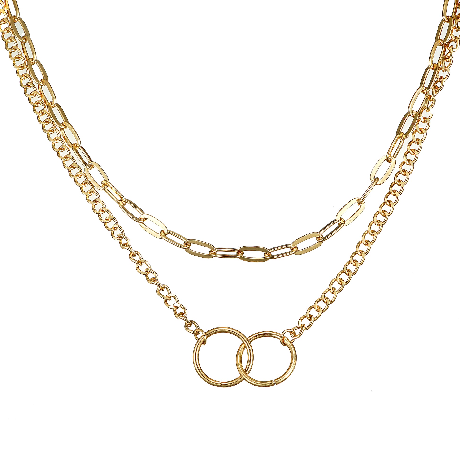 Double Layered Chain Double Circle Necklace – Yellow Gold Plated