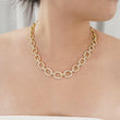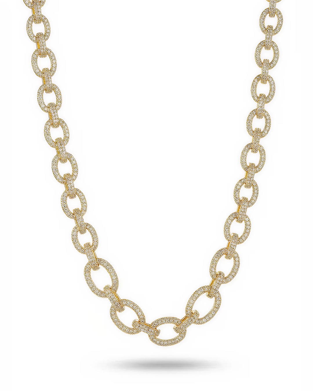 Elevate your style with this Gold Link Pavé Chain Necklace, featuring sparkling simulated diamonds set on high-quality brass and finished with yellow gold plating for a luxurious, long-lasting shine. The bold, polished link design exudes modern sophistication, making it perfect for layering or wearing as a standalone statement piece.