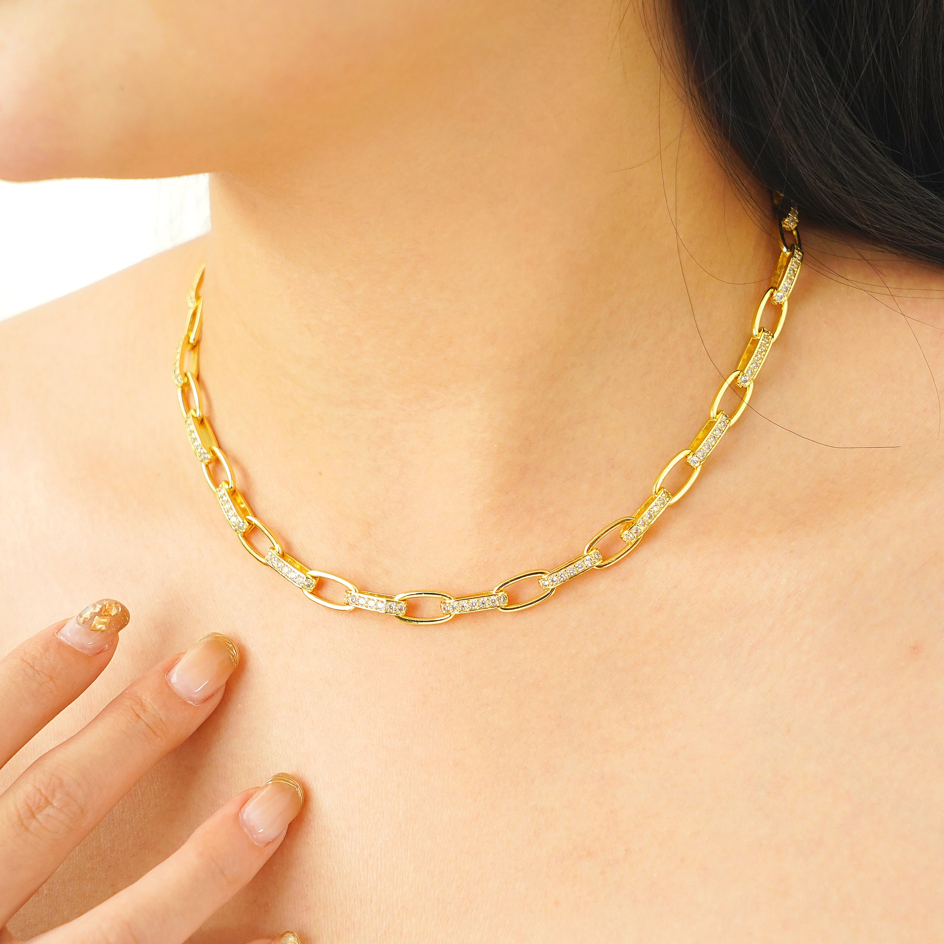 Step into timeless elegance with our Paper Clip Necklace in yellow gold plating, accented with dazzling pavé simulated diamonds. A modern take on the iconic paperclip chain necklace, this piece blends minimalist sophistication with radiant sparkle—perfect for both everyday wear and special occasions.