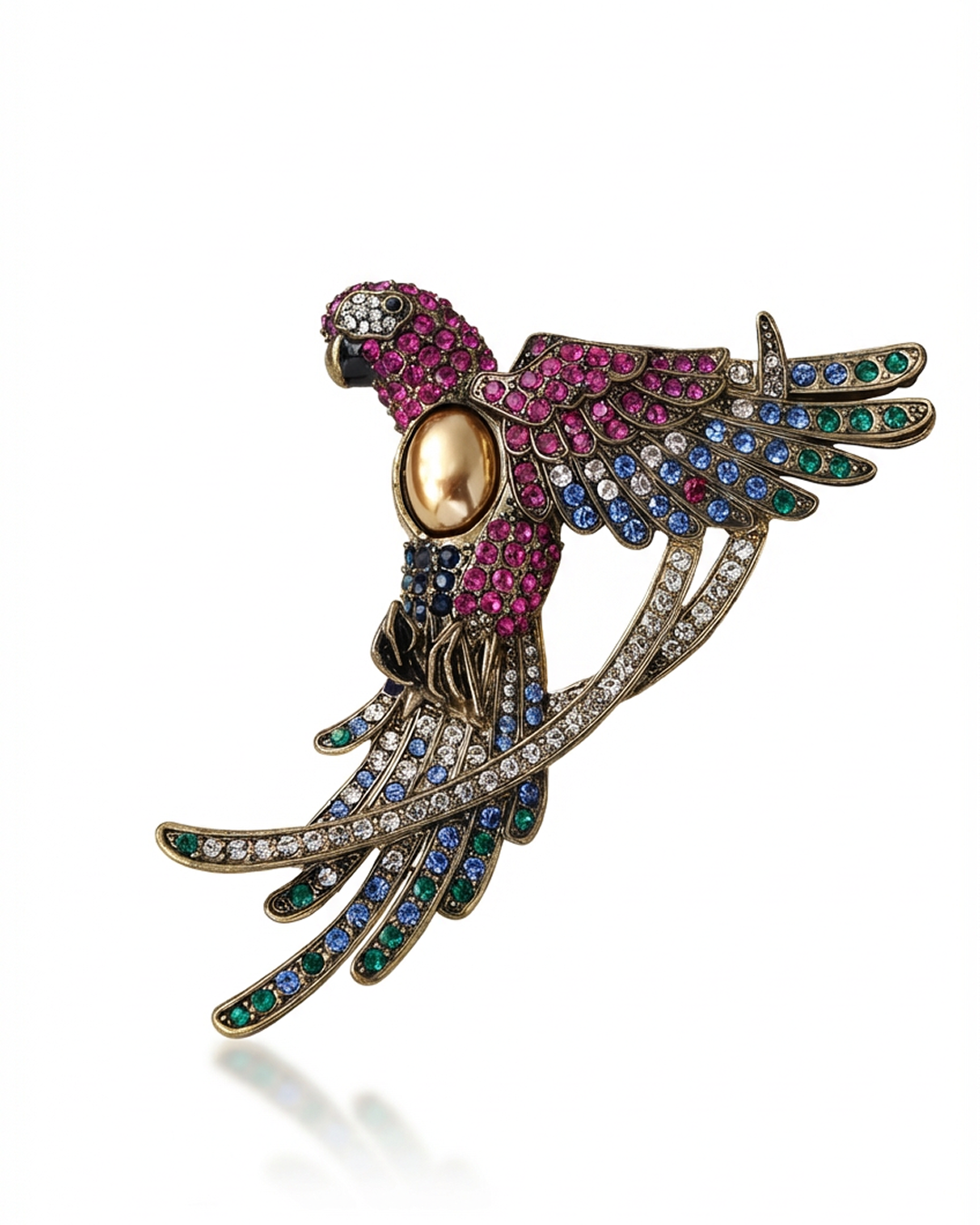Bring a playful yet luxurious touch to your style with this Statement Parrot Brooch Pin, adorned with vibrant multicolor crystals and finished in yellow gold plating over brass. The detailed parrot design captures whimsy and elegance, making it a standout accessory for jackets, dresses, scarves, or hats.
