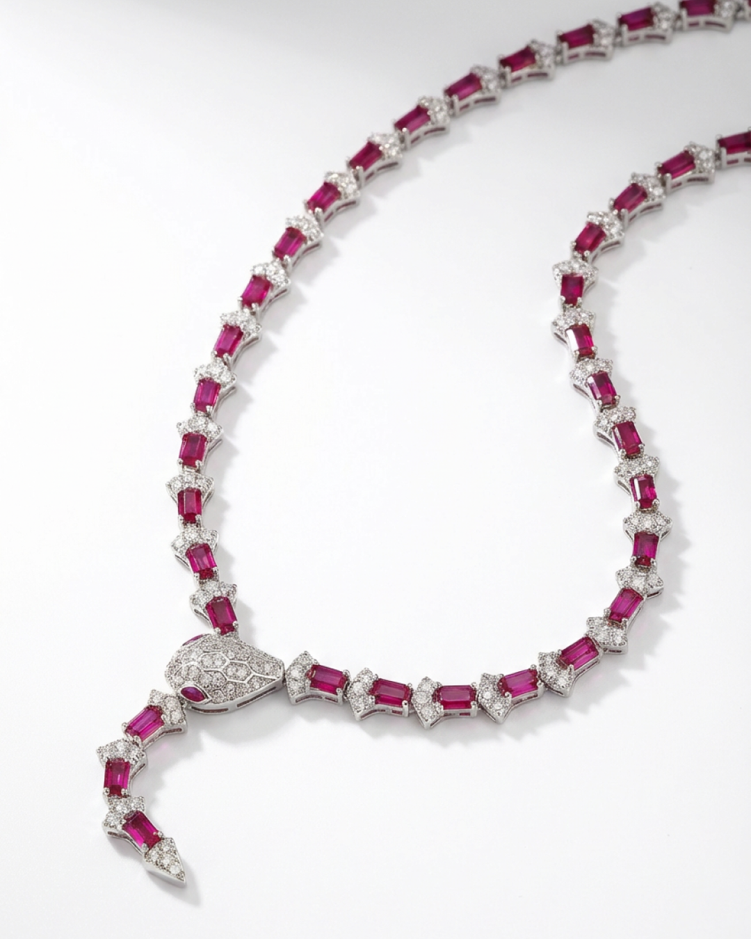 Make a fierce and luxurious statement with this Statement Snake Necklace, crafted in high-quality brass and adorned with pavé simulated diamonds and a striking simulated ruby accent. Bold, artistic, and mesmerizing, the snake design symbolizes power, protection, and transformation, making it a meaningful accessory as well as a fashion-forward piece.